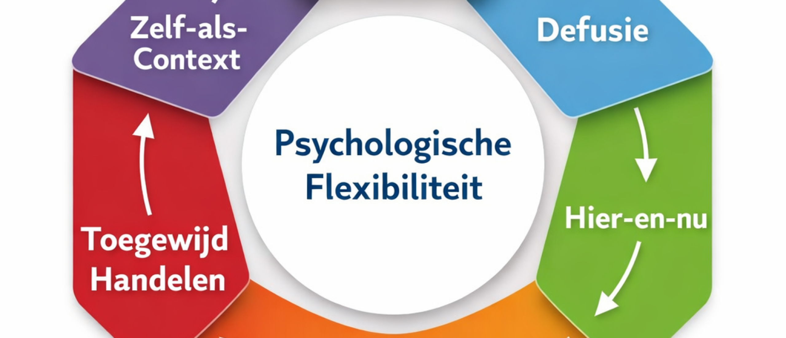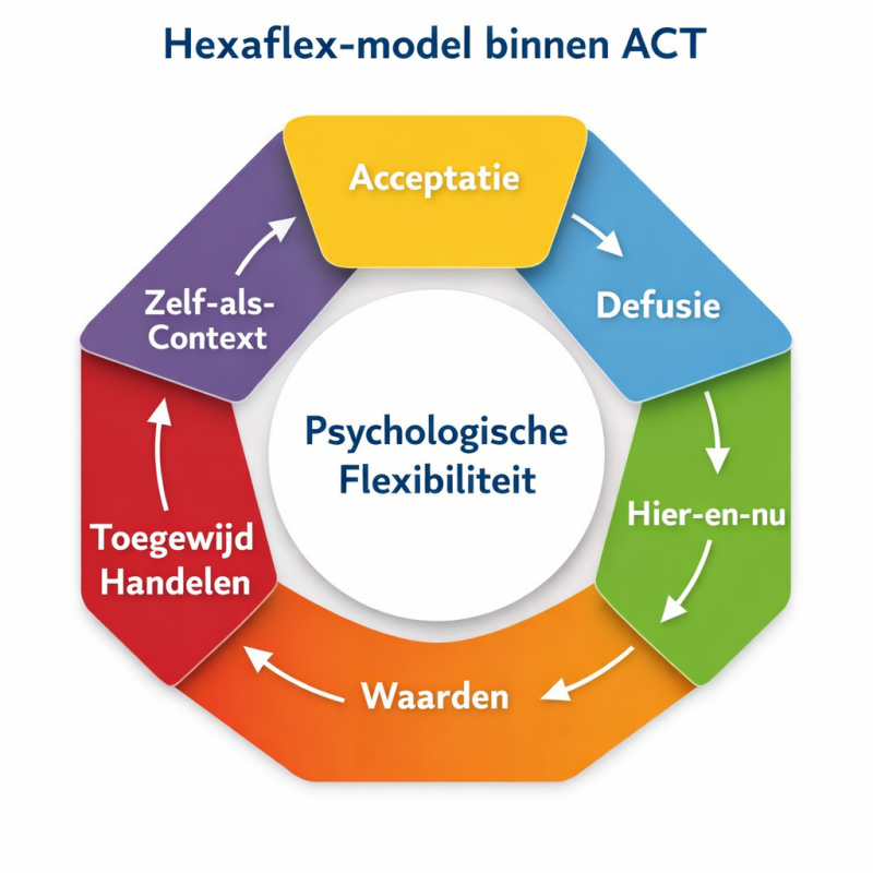 Het hexaflex-model is een visuele weergave van de zes kernprocessen van Acceptance & Commitment Therapy (ACT). Het model wordt veel gebruikt binnen ACT-opleidingen, begeleiding en onderzoek om inzicht te krijgen in hoe psychologische flexibiliteit ontstaat en hoe gedrag vast kan lopen.